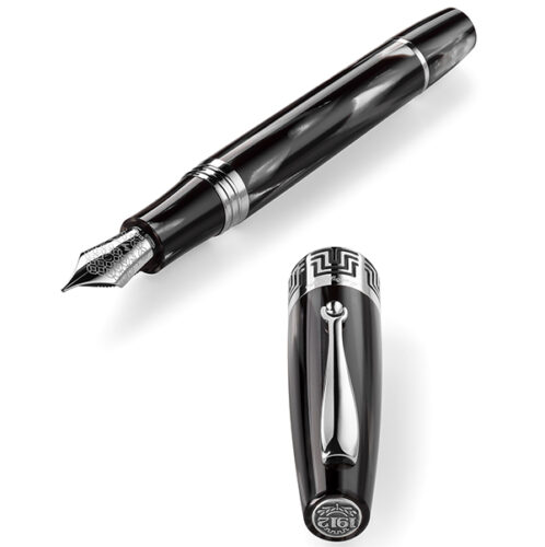 Корпус роскошной перьевой ручки создан из драгоценного целлулоида черного цвета с перламутром. Изящные детали выполнены из серебра. Кольцо колпачка декорировано оригинальным орнаментом и гравировкой в виде логотипа бренда. Верхушку украшает выгравированный год создания компании Elmo & Montegrappa. Колпачок оснащен удобным зажимом с традиционной вращающейся сферой. Завершает композицию элегантное перо из белого золота в 18 карат.